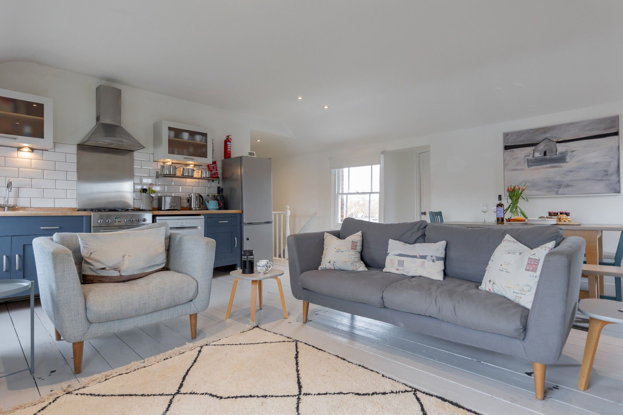 The owner has carefully blended whites and cool greys with pops of vibrant colour to create and modern, yet homely and comfortable feel throughout this popular open plan flat. Inside you’ll find plenty of home comforts, there are comfortable sofas and chairs and a Smart TV with sound bar for a great viewing experience, plus a large dining table, perfect for enjoying long chatty dinners. For cooler winter evenings, there's an open fireplace too. The kitchen is well-equipped, making meal preparation during your stay nice and easy.