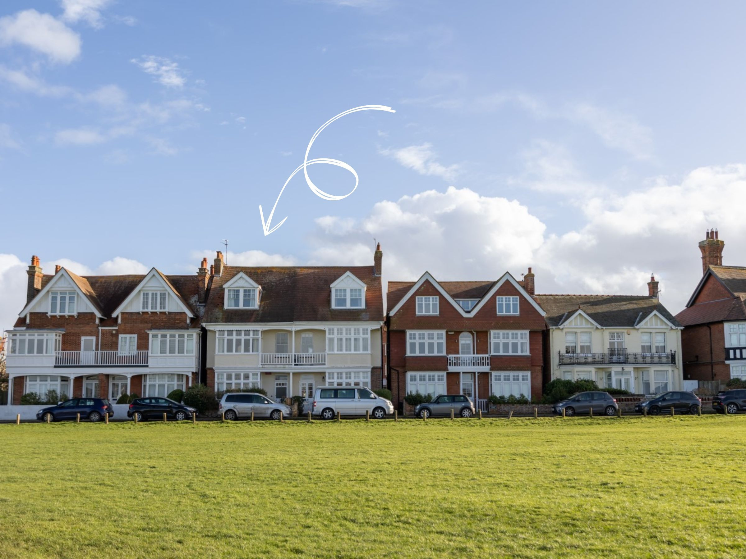 Sitting Room: Two-seater sofa, Three-seater sofa, 3 x lounge chairs, Smart TV, fireplace, large bay window overlooking the common.